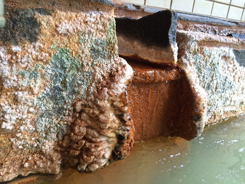 お湯は樋を流れ2箇所に分かれてメインの湯船に注がれていますが、そのどちらにも成分が堆積し、小さいながらも見応えのある状態になっていました。