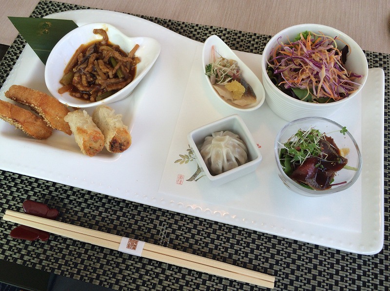 こちらが最初に運ばれてきたメインのプレートとなります。この時のお料理は、豚肉の炒め物・揚げ物2種・ローストビーフ・焼売・鰊のマリネ・サラダ。