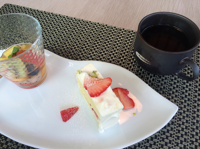 食後のデザートはイチゴショートケーキと果物のシロップ漬。飲み物はコーヒーと中国茶のどちらかになりますが、「疲労回復効果のある中国茶」と聞いてそちらにしました。