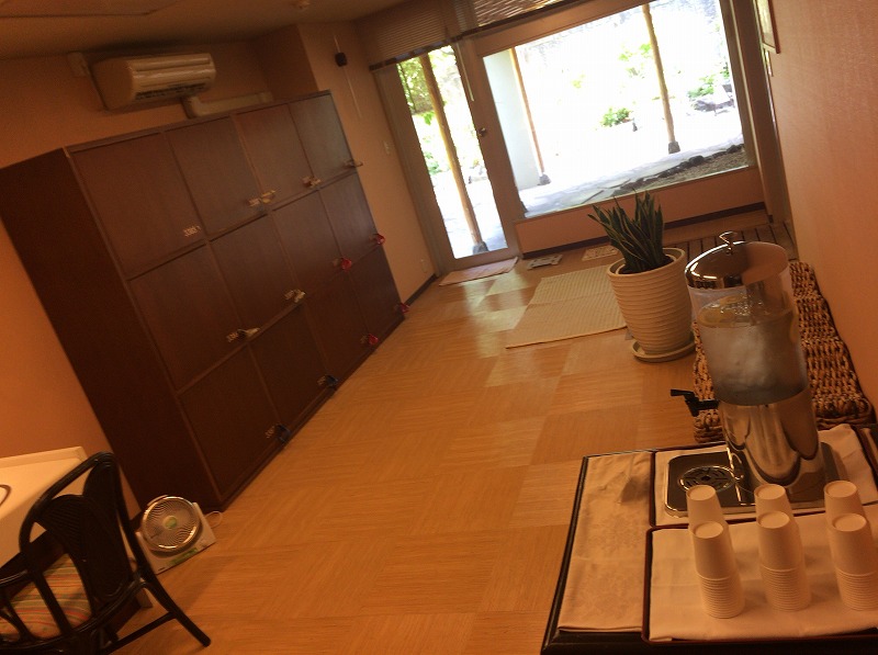 鍵付きのロッカーは12人分。大きなロッカーで、中にはスリッパを入れるスペースまで用意されていました。飲料水も用意されていますが、レモン水だったのが嬉しいです。