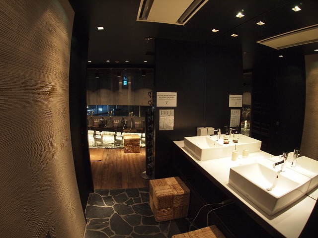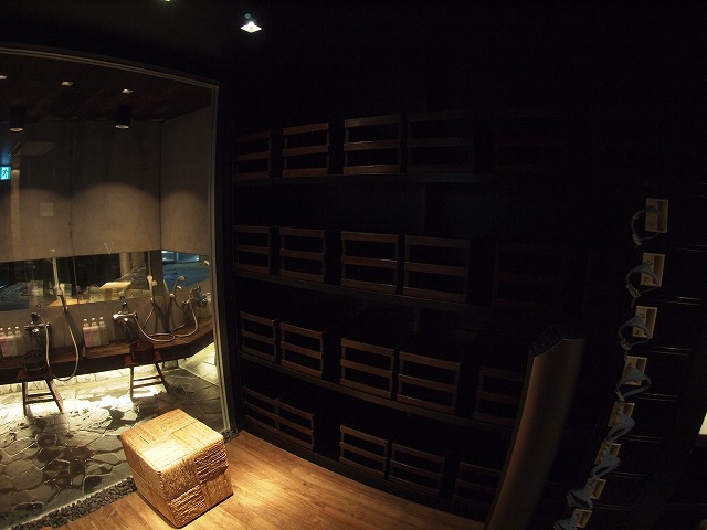 木の棚に木でできた箱が並んでいますが、脱衣カゴさえインテリアにしてしまおうという雰囲気。さらに脱衣スペースはガラス張りで浴室が丸見えです。これまで見たことがないような脱衣場で新鮮でした。