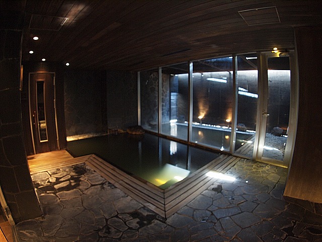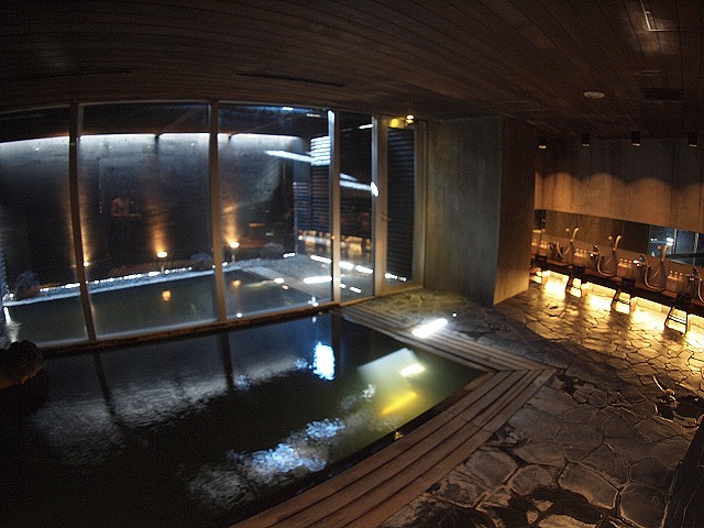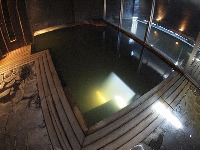 内湯は10人ほどが入れる大きさです。写真では見辛いのですが、窓際の側がほぼ水面近くまでの段差になっていて、水深1センチ程度でしょうか。座っても直接肌に触れる部分はお湯で暖かく、のんびりするのにちょうど良い造りとなっていました。