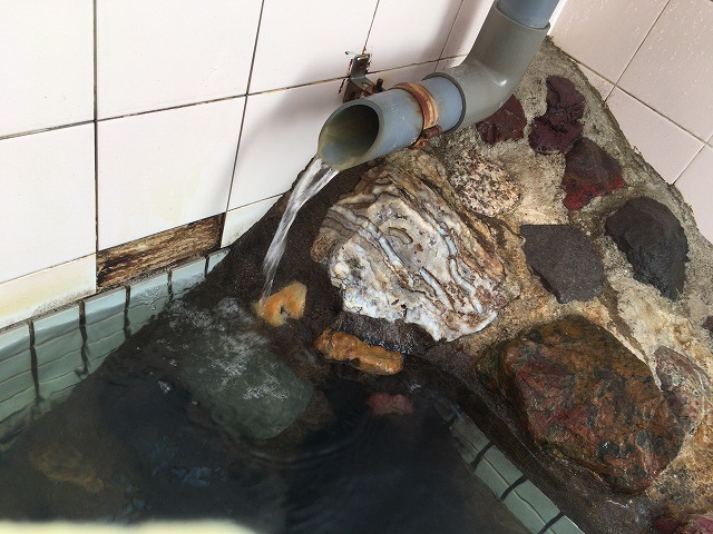 銭湯部分の湯船では湯口の横に水道の蛇口があって常に加水されていますが、こちらでは同じく蛇口はあるものの加水なし。家族風呂用の源泉タンクと思われるものがちょうどこの部屋の外にあり、外気が冷たいので加水なしでも良いのかもしれません。