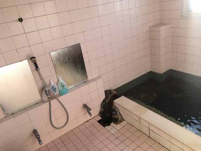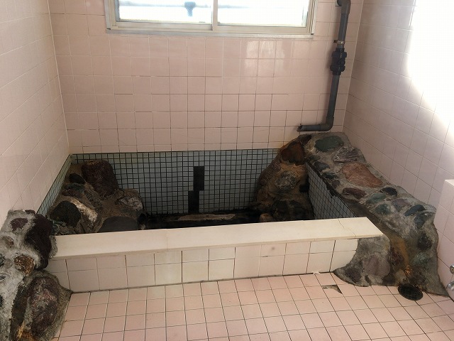 早速浴室に入ると、ピンク色のタイルに囲まれた岩風呂風の湯船が1つ。