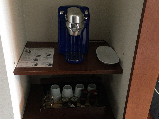 お部屋に電気ケトルが置いてあるところは多いですが、最近ホテルでよく見るのはこのタイプのコーヒーマシン。こちらにはキューリグのマシンがありました。