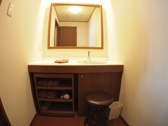 すっきりとした感じの脱衣場。棚にタオル類が置いてあります。