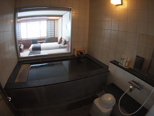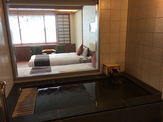 ベッドサイドに大きなガラスがありますが、その向こうが楽しみな温泉です。