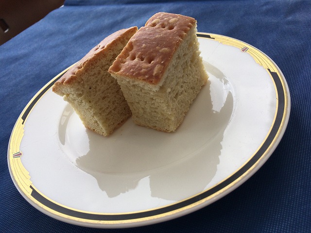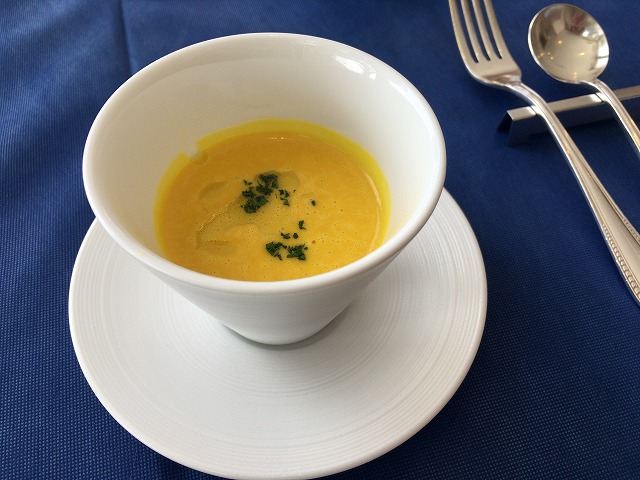 前菜はカボチャスープ。パンはオリーブオイルでいただきました。
