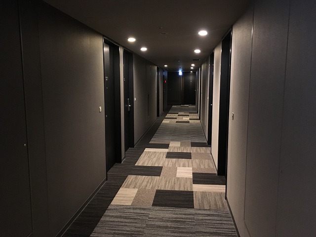 エレベーターに乗った際に流れるアナウンスが英語のみで、どんなお客さんをターゲットにしているか分かりやすかったです。廊下のタイルの柄と建物の外観の柄、デザインが共通していることに後から写真を見て気付きました。