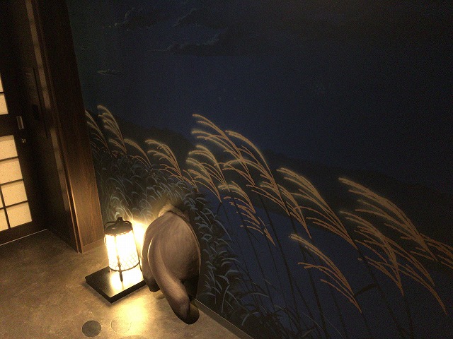 浴室という使用条件ゆえイミテーションではありますが、障子や灯篭といった日本的な素材が取り入れられています。