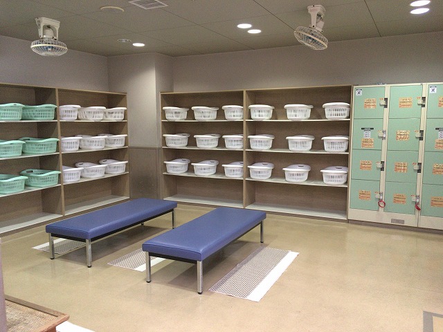 木の棚にプラスチックの脱衣かご。シンプルな脱衣場でした。