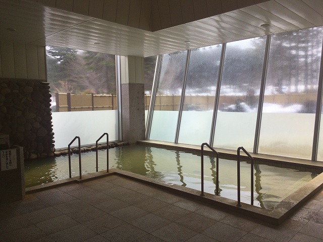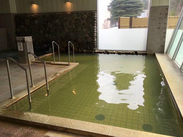 緑色に見える湯色が目に嬉しいです。15-20人ほど入れる大きさがあり、浴槽内で温度は43.0℃でした。