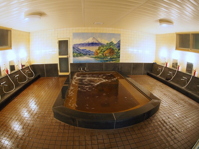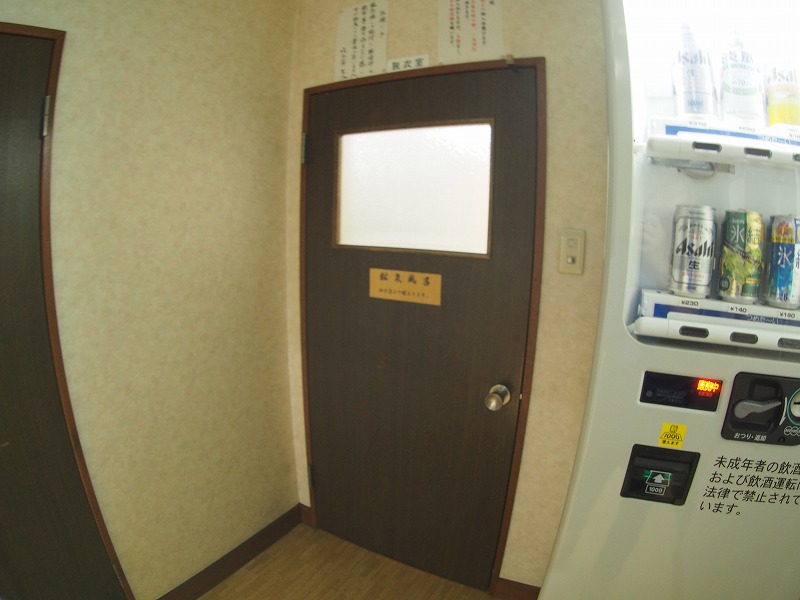 昼食が遅かったため夕食は食べに行かず、近くのコンビニで飲み物などを購入して早速お風呂へ。「鉱泉風呂」の掲示がある脱衣場のドアを入ります。