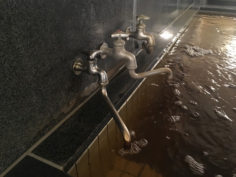 浴槽の壁には蛇口がいくつか並んでいますが、一番手前の蛇口から出るのは加温なしの源泉そのままと思われます。