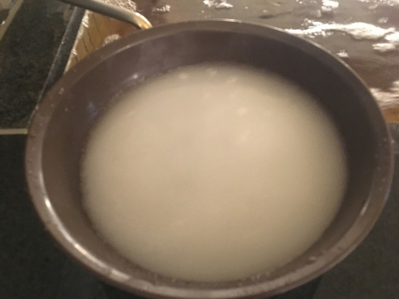 洗面器に溜めると、源泉に含まれる気体の成分なのか、出した直後は真っ白に。
