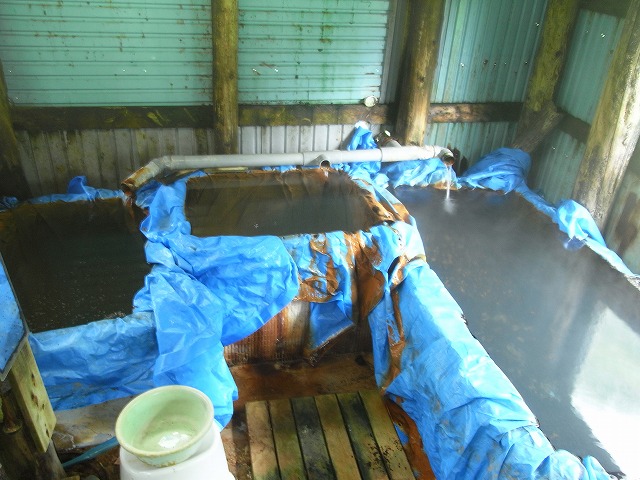 湯船は3つあり、浴槽にブルーシートをかけて使用しています。